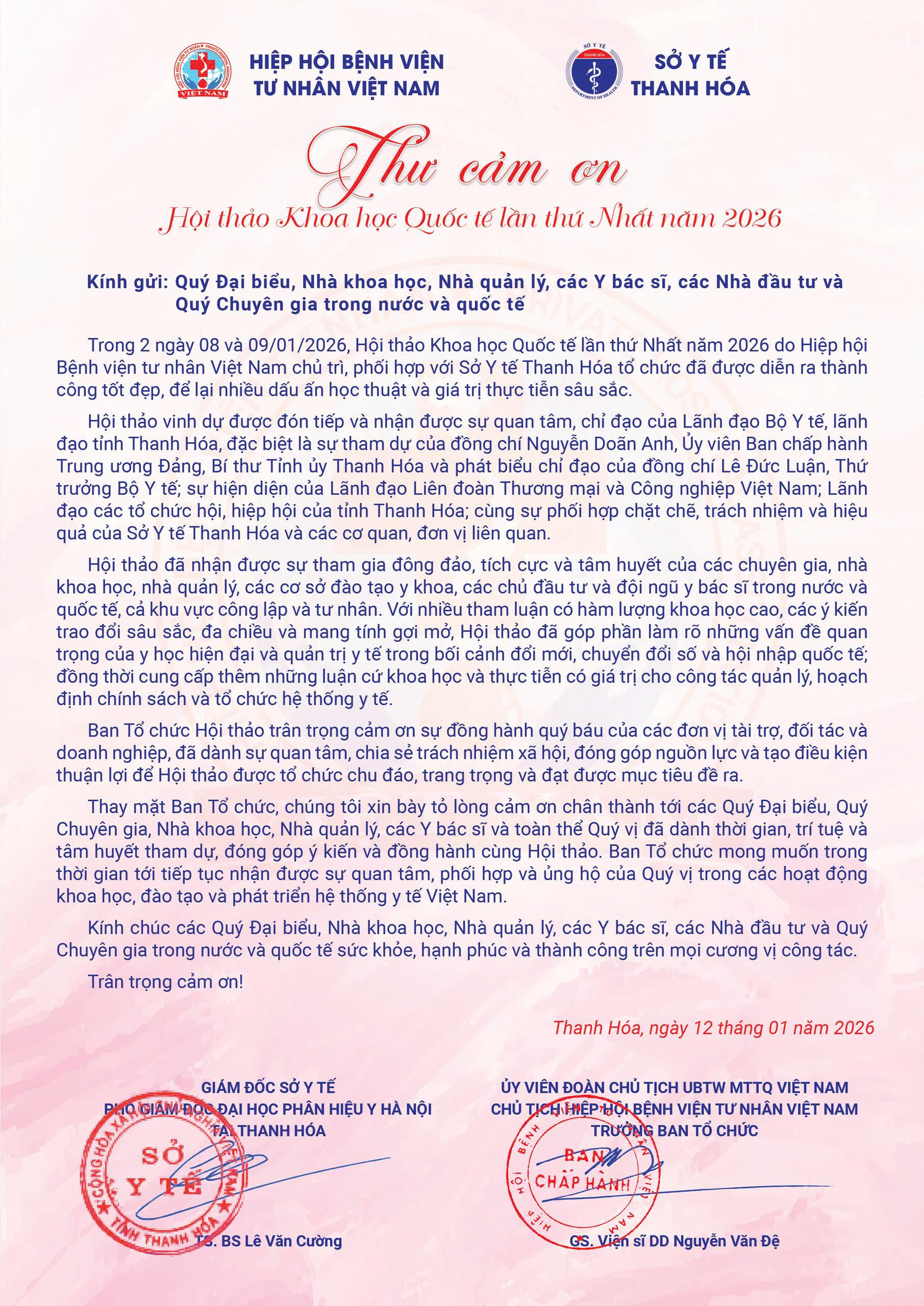 Hiệp hội Bệnh viện tư nhân Việt Nam trân trọng gửi tới Quý Đại biểu, Nhà khoa học, Nhà quản lý, các Y bác sĩ, các Nhà đầu tư và Quý Chuyên gia trong nước và quốc tế lời cảm ơn sâu sắc về sự quan tâm, tham dự, đồng hành và những đóng góp quý báu đối với sự thành công của Hội thảo khoa học Quốc tế lần thứ nhất tổ chức vào ngày 8 & 9/01/2026 tại tỉnh Thanh Hóa.